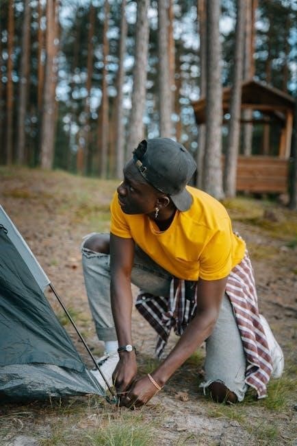 Setting up the Cabela’s Alaskan Guide Tent involves a systematic approach. Begin by unpacking and laying out the tent footprint, followed by attaching the poles to the corners. Stand the tent upright, securing the top pole first, then the side poles. Stake down the base firmly, ensuring even tension. Attach the rain fly, connecting it to the tent’s peaks and sides. Finally, tighten all guy lines and stakes to ensure stability. The process is designed for efficiency, making it manageable for campers of all experience levels.